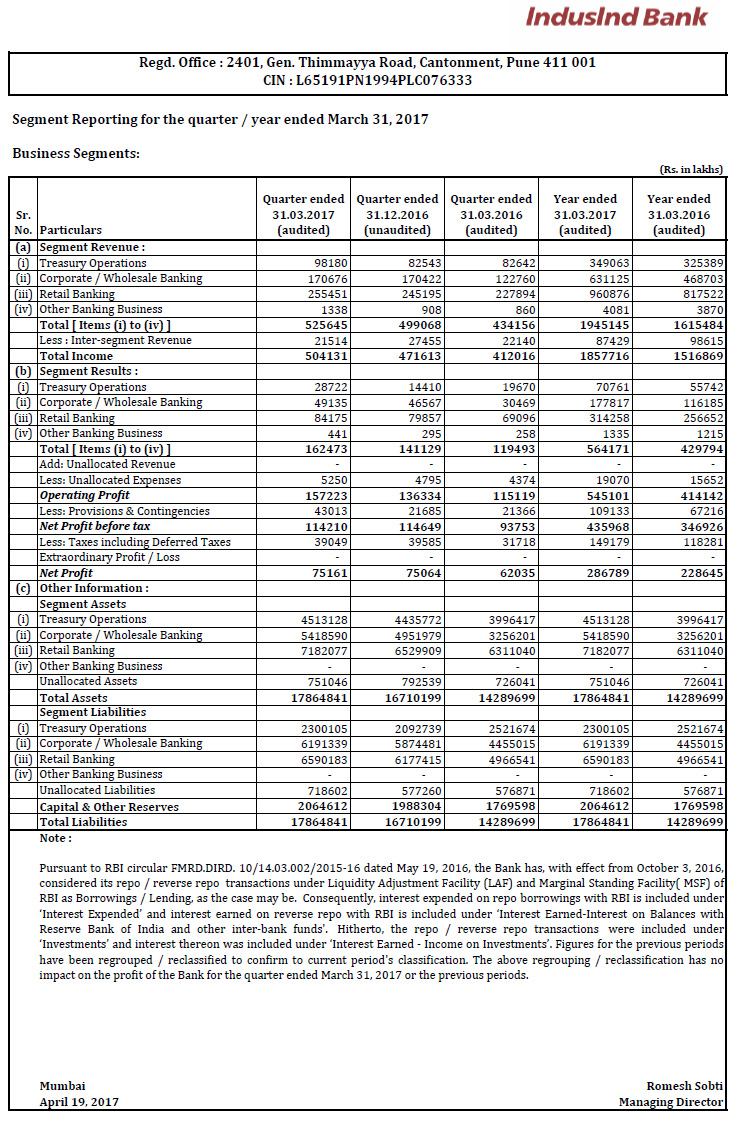 4 | The above financial results for the quarter and year ended March 31, 2017 were reviewed by the Audit Committee and subsequently have been taken on record and approved by the Board of Directors at its meeting held on April 19, 2017. These financial results were subjected to an Audit by the Statutory Auditors of the Bank. A clean report has been issued by them thereon. |