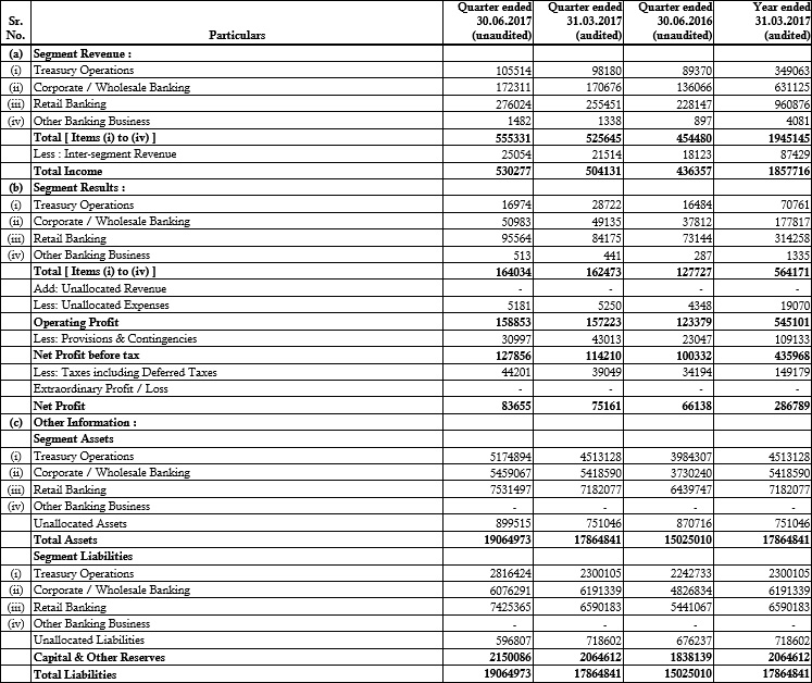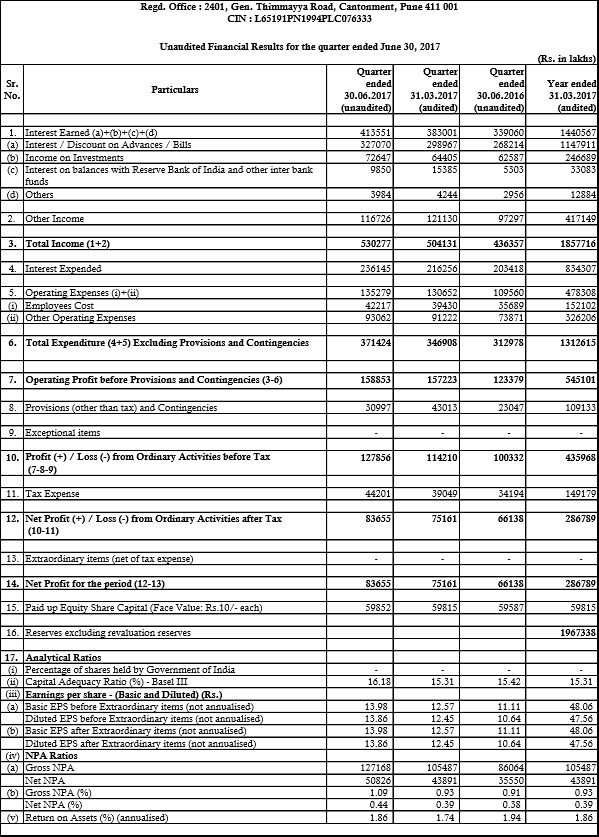 - The above financial results for the quarter ended June 30, 2017 were subjected to a Limited Review by the Statutory Auditors of the Bank. A clean report has been issued by them thereon. These financial results were reviewed by the Audit Committee and subsequently have been taken on record and approved by the Board of Directors at its meeting held on July 11, 2017