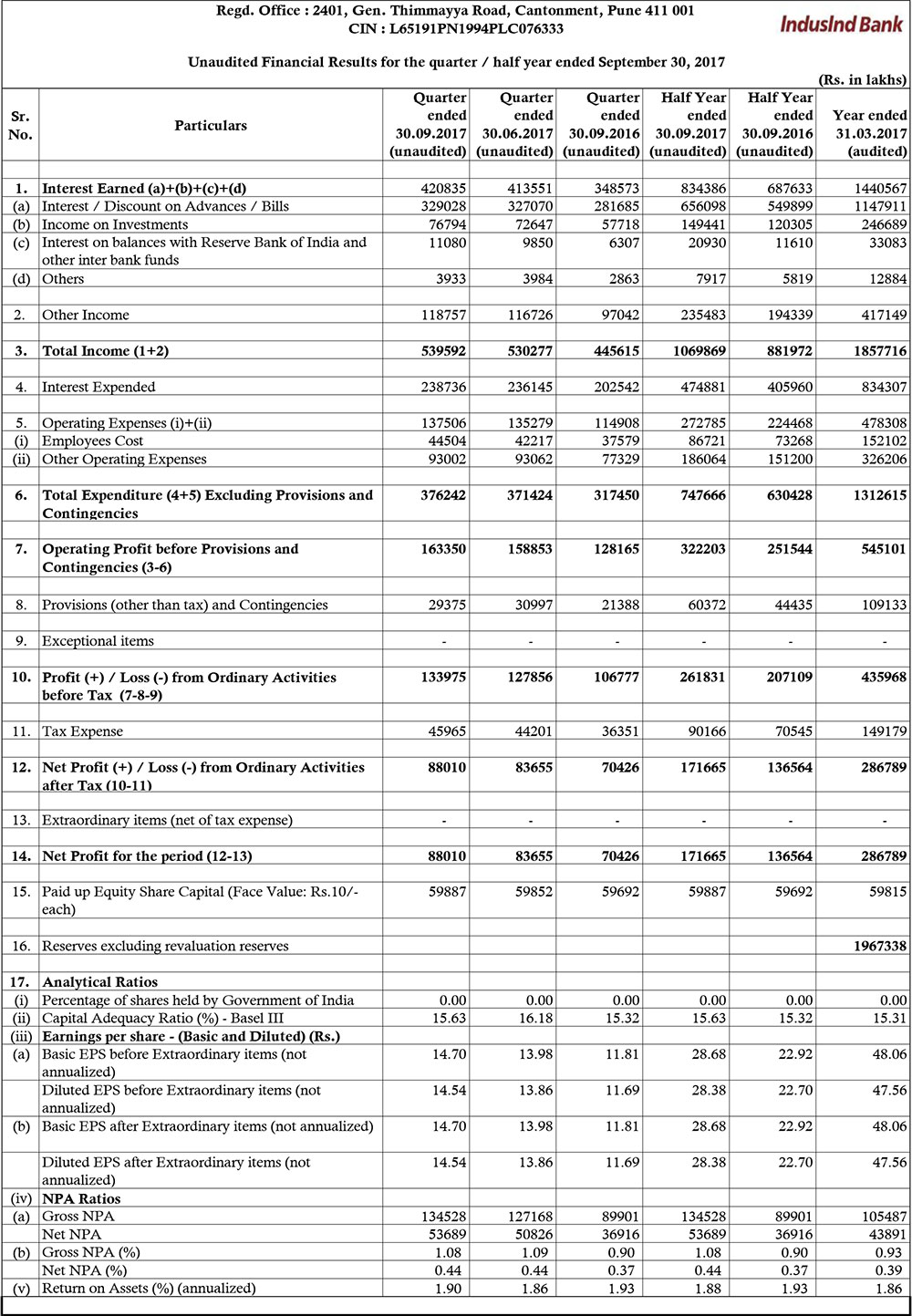 - The working results for the quarter / half year ended September 30, 2017 have been arrived at after considering provision for standard assets, including requirements for exposures to entities with Unhedged Foreign Currency Exposure, non-performing assets (NPAs), depreciation on investments, income-tax and other usual and necessary provisions.