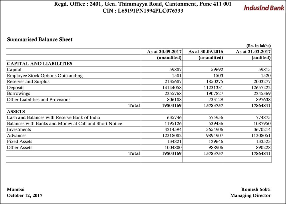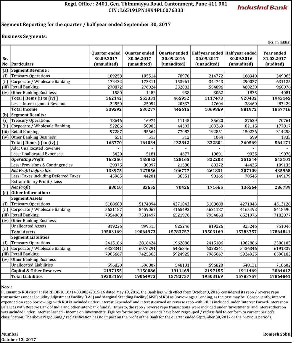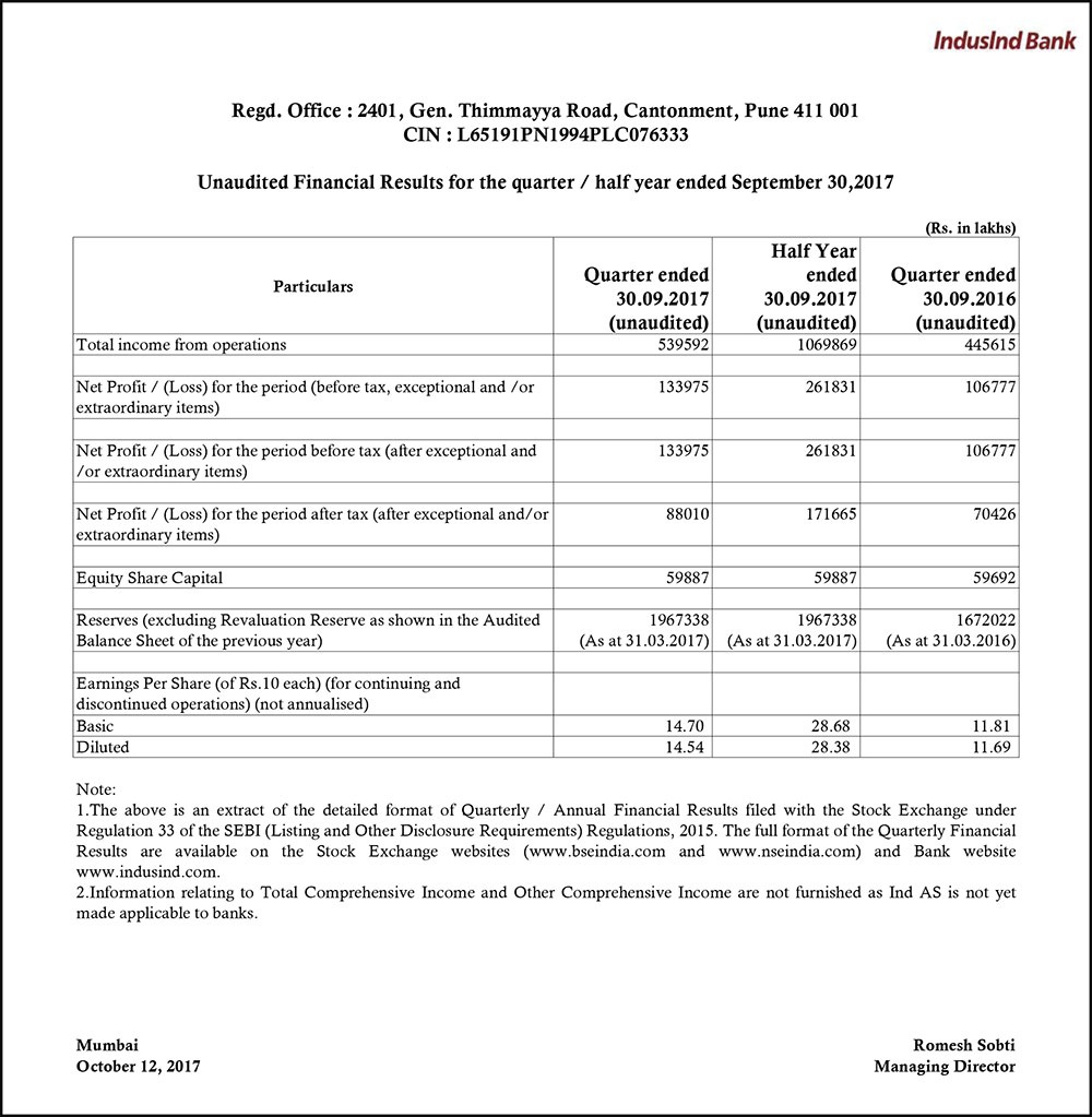 - The above financial results for the quarter / half year ended September 30, 2017 were subjected to a Limited Review by the Statutory Auditors of the Bank. A clean report has been issued by them thereon. These financial results were reviewed by the Audit Committee and subsequently have been taken on record and approved by the Board of Directors at its meeting held on October 12, 2017.