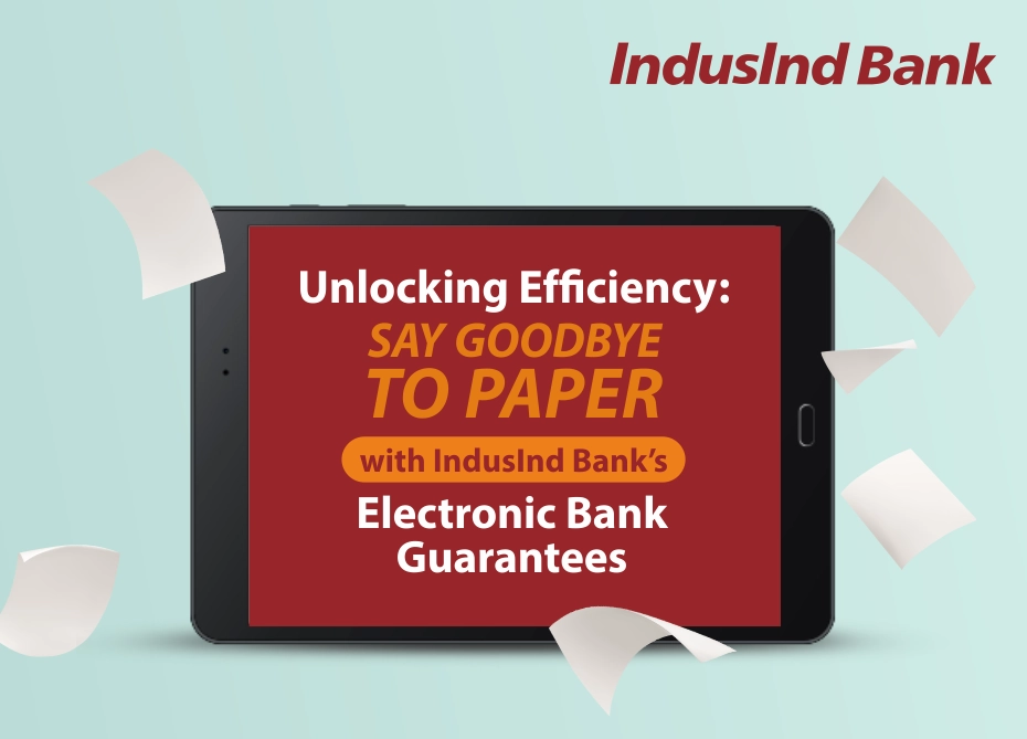 IndusInd Bank, in collaboration with National e-Governance Services Ltd (NeSL), is delighted to present the Electronic Bank Guarantee (e-BG) service, designed to deliver enhanced convenience in Bank Guarantee transactions.